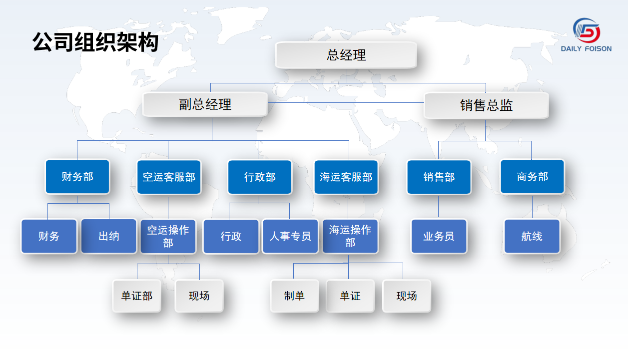 SHANGHAI DAILY FOISON SUPPLY CHAIN MANAGEMENT CO.,LTD Founded in 2019, It is a comprehensive logistics service company specializing in import and export shipping, air transportation, customs clearance, warehousing, logistics, supply chain management, etc.A first-class international logistics agency approved by the Ministry of Logistics communications of the people's Republic of China, with the qualification of Non-Vessel Operating Common Carrier
